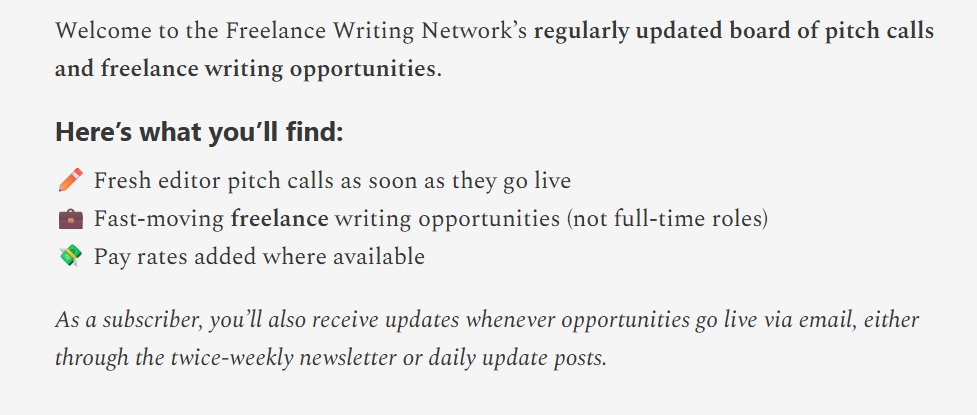 It’s a way of building a shared space for like-minded creators and professionals in your field, and establishing your expertise. For example, The Freelance Writing Network runs a daily pitch calls and job board hosted on Substack. It’s a relatively simple concept to set up using an existing platform, and they monetize by clearly outlining the value of being a paid subscriber: