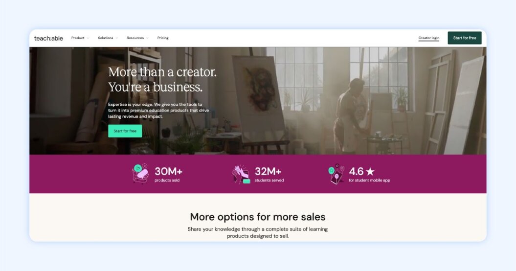 Teachable makes it easy to sell online courses, memberships, and coaching. They’ve carved out a unique position as a platform with a free plan that makes it easy for beginner creators to get started selling courses.